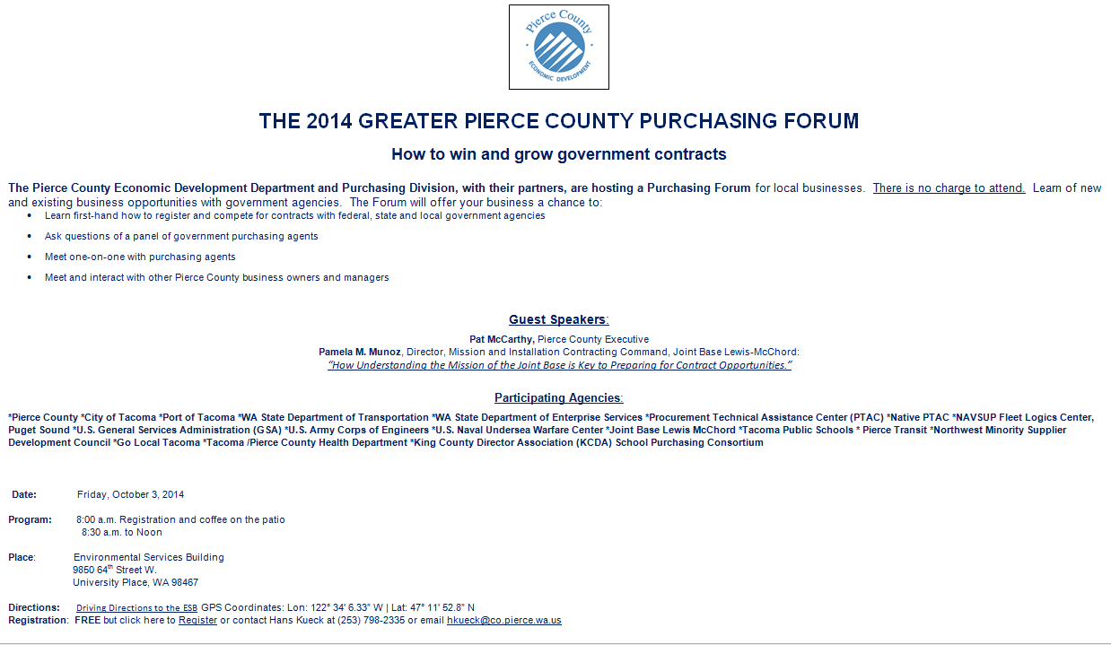 A Purchasing Forum for local businesses. There is no charge to attend. Learn of new and existing business opportunities with government agencies. The Forum will offer your business a chance to: